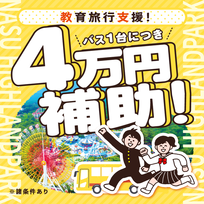 昨今の燃料費高騰、人手不足、人件費上昇などの要因により、旅行内容を縮小する学校団体も増えてきています。那須ハイランドパークは「社会問題をビジネスで解消する」をモットーに掲げ、那須ハイランドパークで対象条件を満たす団体に対し、バス1台40,000円の補助を実施し、未来あるこどもたちの体験活動を守れる活動を行います✨